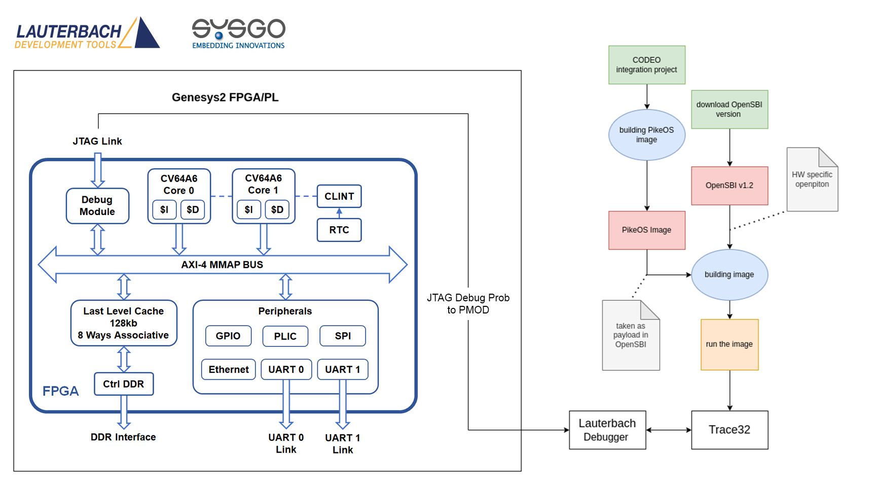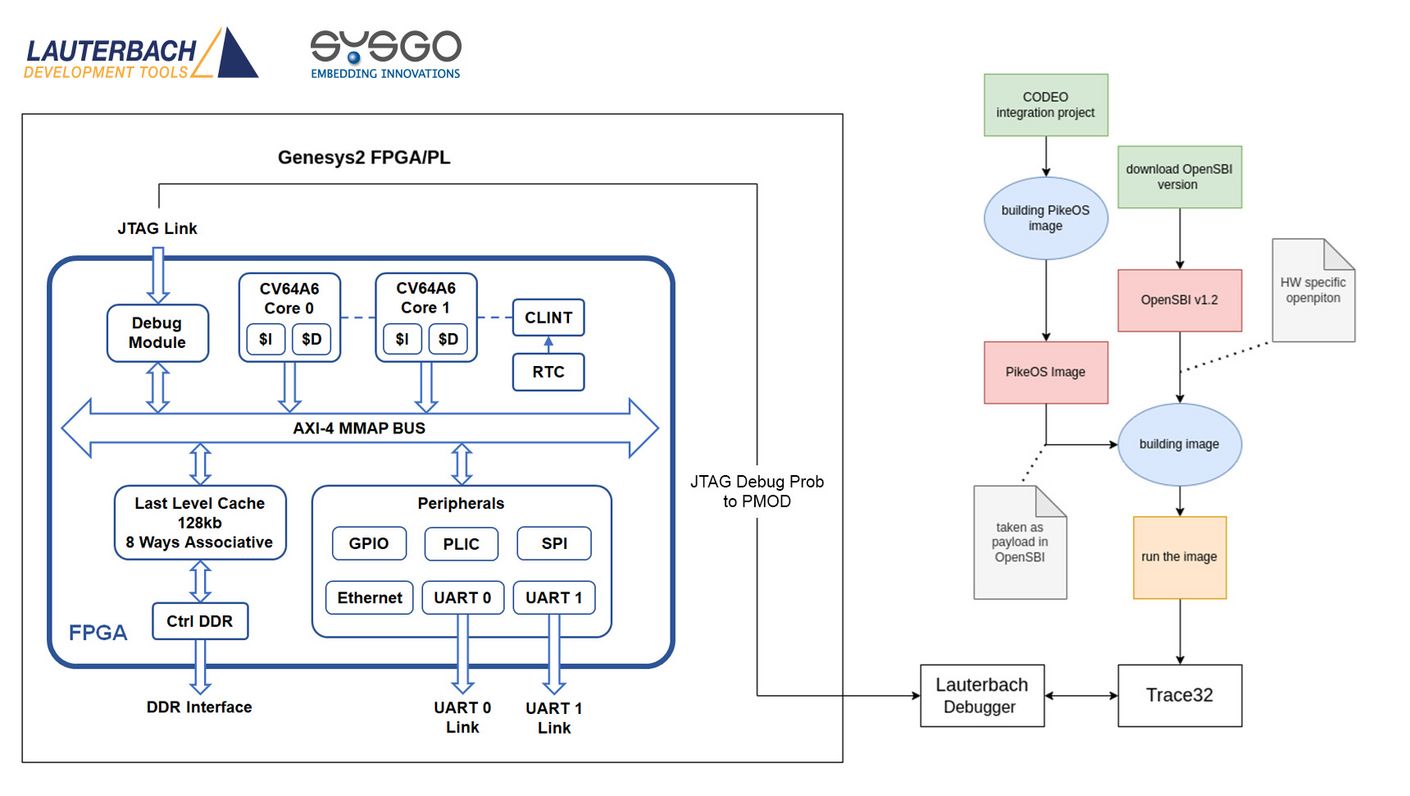 In the scope of the ISOLDE project, we’ve been working on integrating PikeOS into a custom System-on-Chip (SoC) platform—Culsans—featuring two CVA6 RISC-V cores. This SoC is deployed on a Genesys2 development board, and a key focus of our effort has been enabling efficient debugging capabilities with Lauterbach's TRACE32, an industry-standard debugging suite.