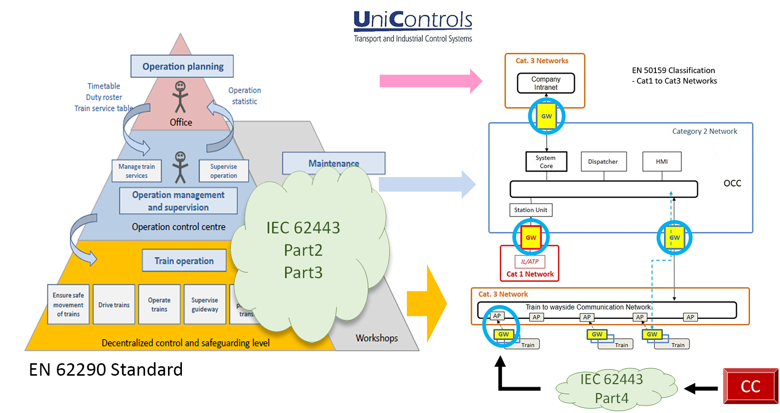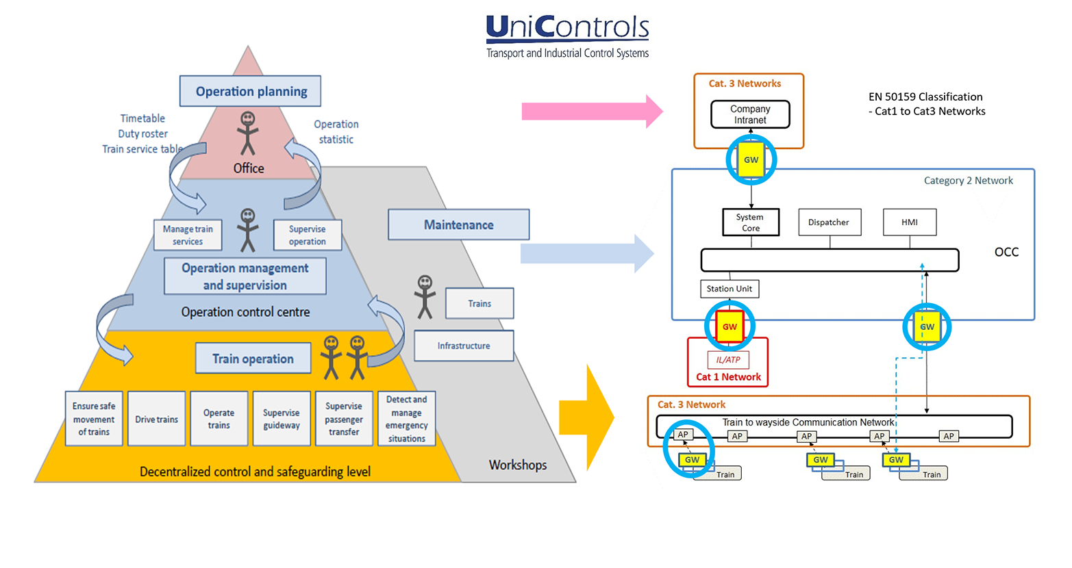 The pilot in short: The subway control networks are classified into three categories: Cat-3 can be an open network where a traffic can hardly be controlled. Cat-2 is a restricted environment where systems such as operation management and supervision reside. Cat-2 network has connection to the company office networks which are Cat-3 (e.g. for schedule planning) and also connected to the Cat-1 network. The Cat-1 network is safety critical network where real-time behaviour, determinism, and dependable execution is a must.