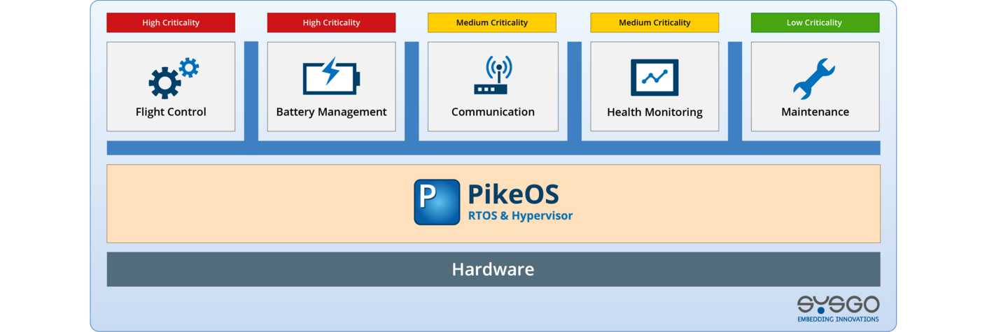 SYSGO leverages its expertise in embedded systems to provide eVTOL manufacturers with high-assurance software solutions based on our PikeOS real-time operating system (RTOS) and hypervisor. PikeOS is certified to the most rigorous Safety (DO-178C up to DAL A) and Security (Common Criteria EAL 5+) standards.