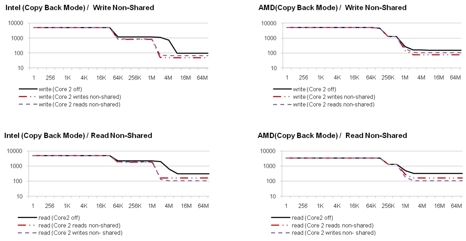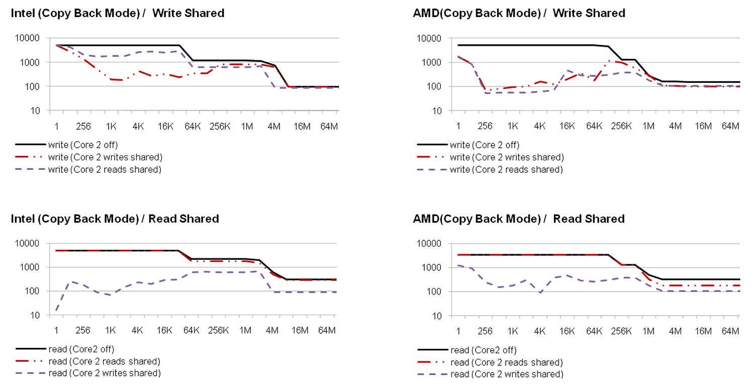 The results of the performance measurements (Figure 2 and 3) show that the bandwidth of the memory bus is shared between the cores. If the cores operate on a data set which is so large that the caches have no effect, the performance drops down to 50% if both cores are active. The same effect has been measured on the PCI bus. While a cache hit rate of 0% may be very unlikely when accessing memory, it is the normal case on the PCI bus since PCI devices are typically accessed with caches disabled.