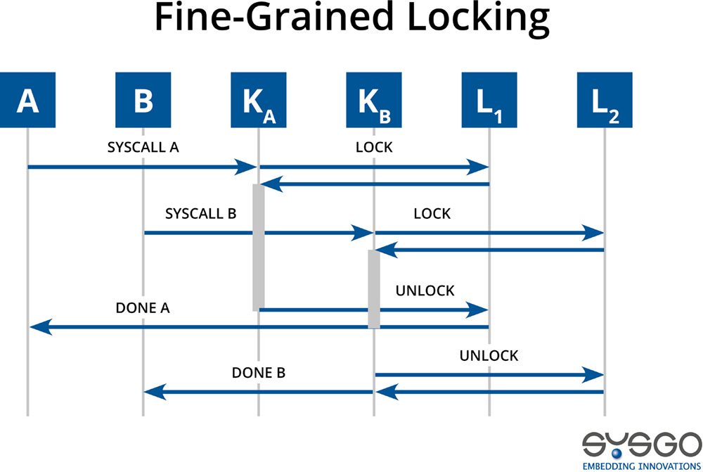 Figure 2 shows what happens when multiple, fine-grained locks are used. The procedure is essentially the same, except that the kernel requests different locks. In this scenario, the KB therefore does not need to wait for a central lock to be released. The situation is therefore largely symmetrical. The effect would be significantly amplified by the addition of further cores – in other words, a system with a central lock scales very badly.