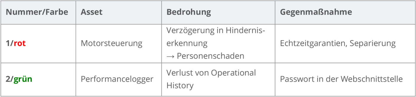 - Über welche Sicherheitsdomänen verfügt das System? Inwieweit sind diese Sicherheitsdomänen vollständig voneinander getrennt, oder können sie (kontrolliert) miteinander kommunizieren? In unserem Beispiel waren der Leistungslogger und die Motorsteuerung unterschiedliche Domänen.