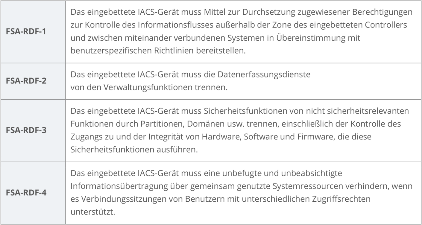 Mit den Standards SDLA (Prozesse), EDSA (funktionale Systeme für Komponenten) und SSA (funktionale Anforderungen für Gesamtsysteme) hat IsaSecure ein präzises Zertifizierungsschema für die IEC 62443-Serie entwickelt, das auch Anregungen aus NIST 800-53 enthält. So enthält EDSA-311 die in der nachstehenden Tabelle aufgeführten Anforderungen an die funktionale Ebene: