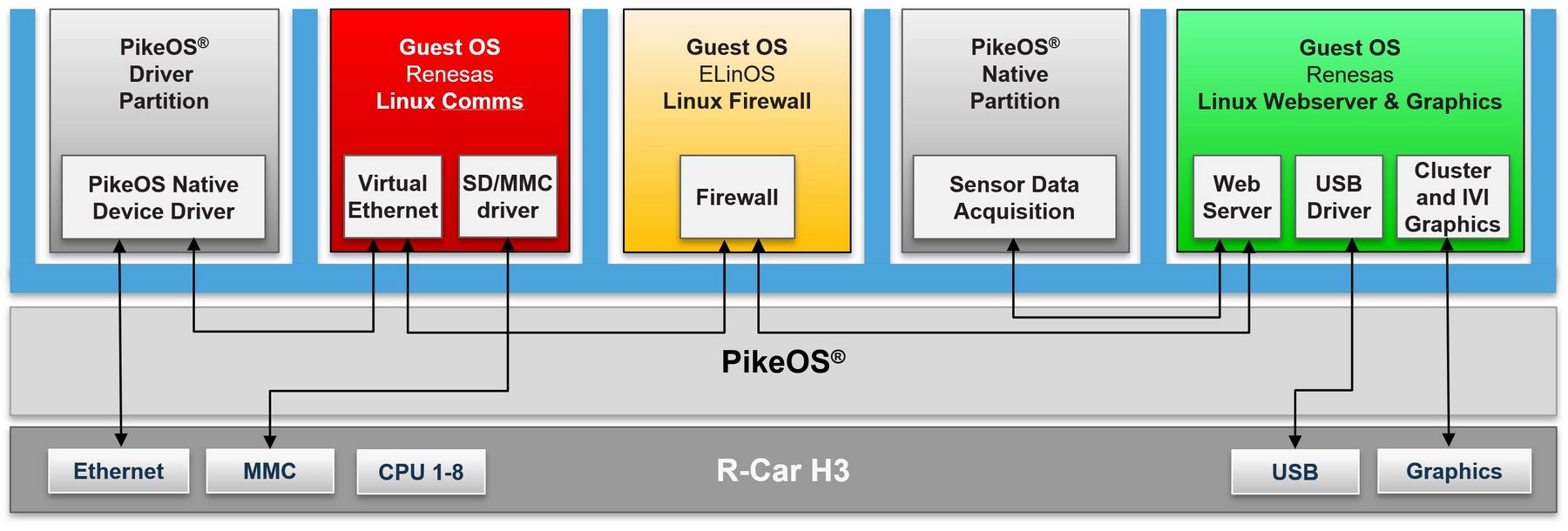 Figure 3: PikeOS in an automotive application based on the Renesas R-Car H3